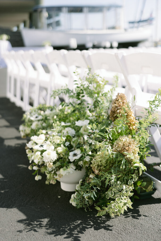 The ceremony took place on Duffy boats, surrounded by all white florals that later moved to the reception space.
