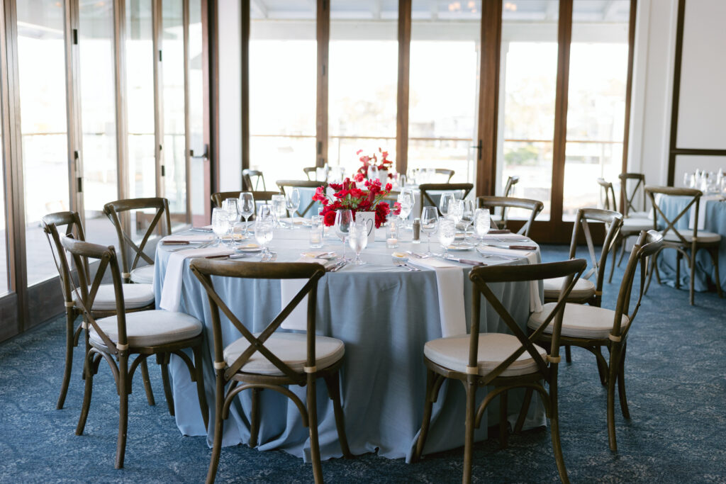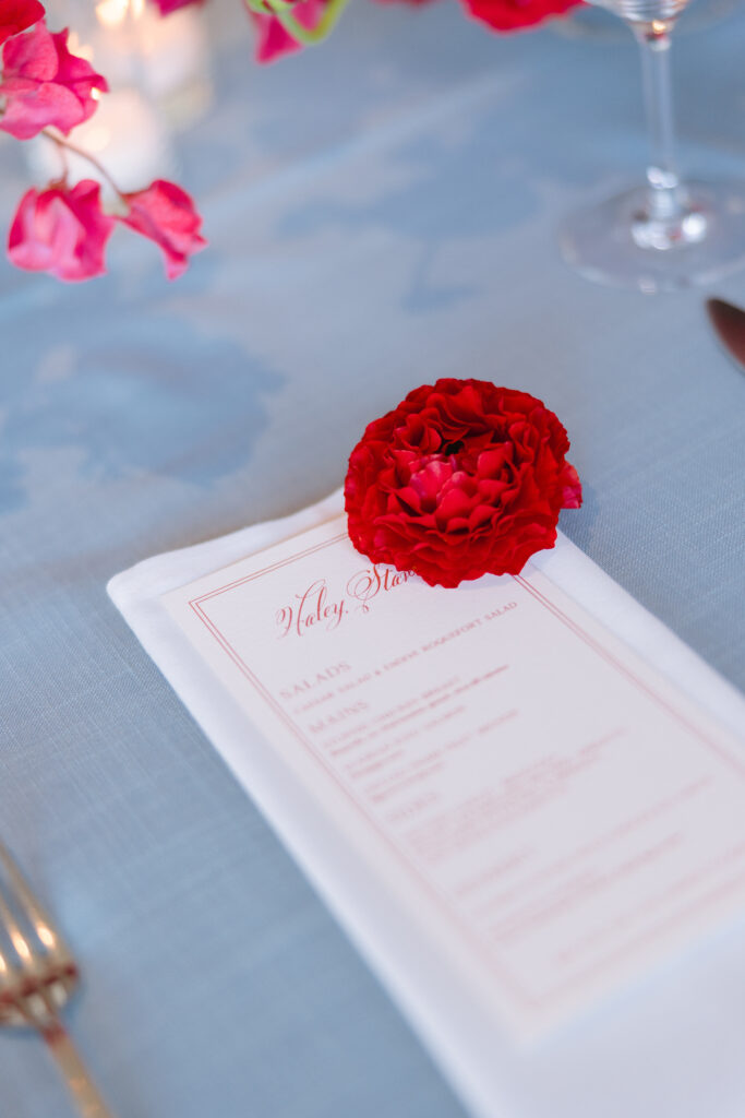 After the I dos, Nicole and Travis boarded their private boat and headed to Newport Yacht Club, followed by guests cruising along on Duffy boats. The ride felt like part of the celebration, not just a transition. The decor leaned into a red, white, and blue palette without feeling themed, inspired by Travis proposing on the Fourth of July and his Navy background. Red florals popped against the nautical setting of the yacht club.