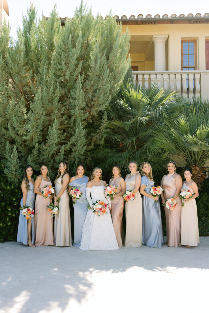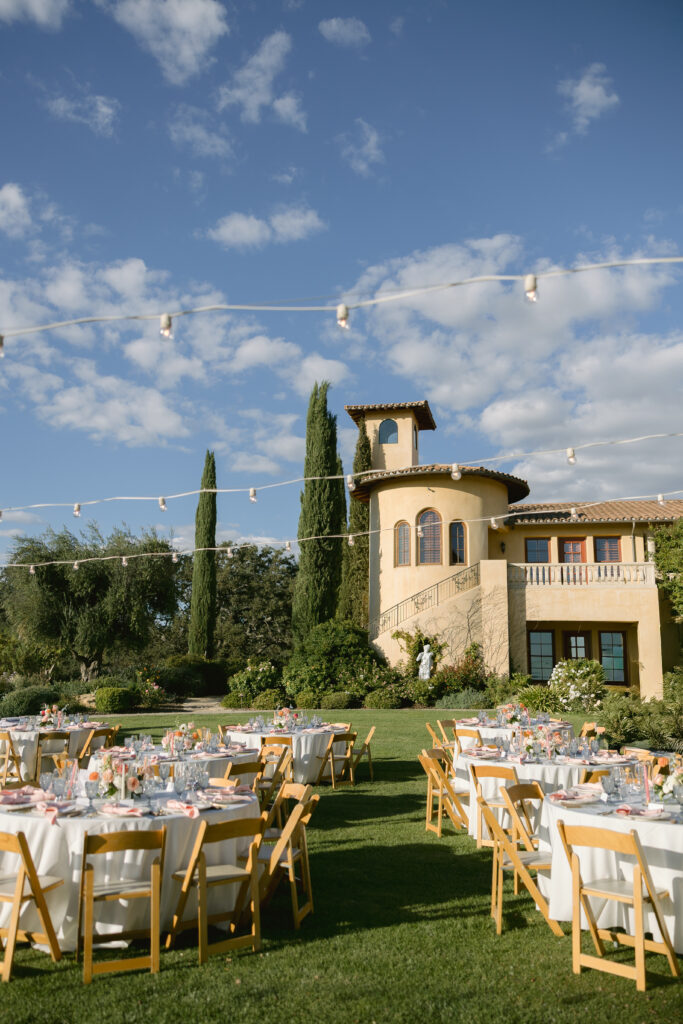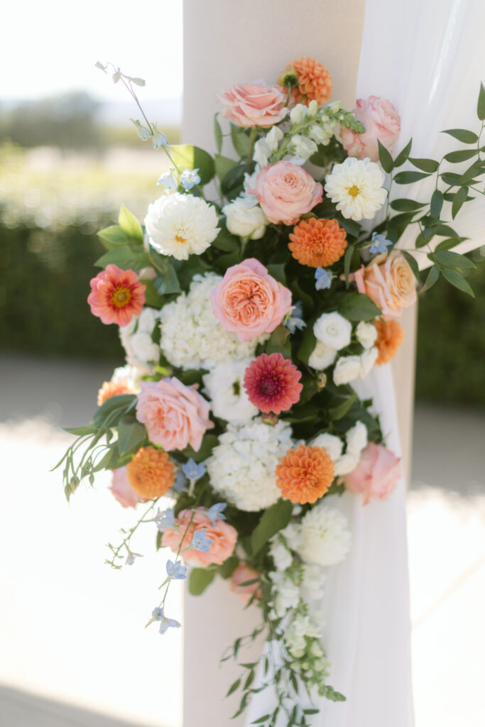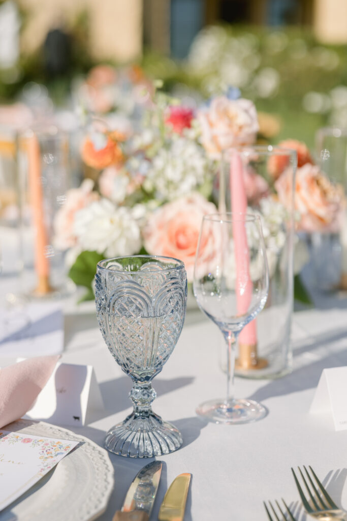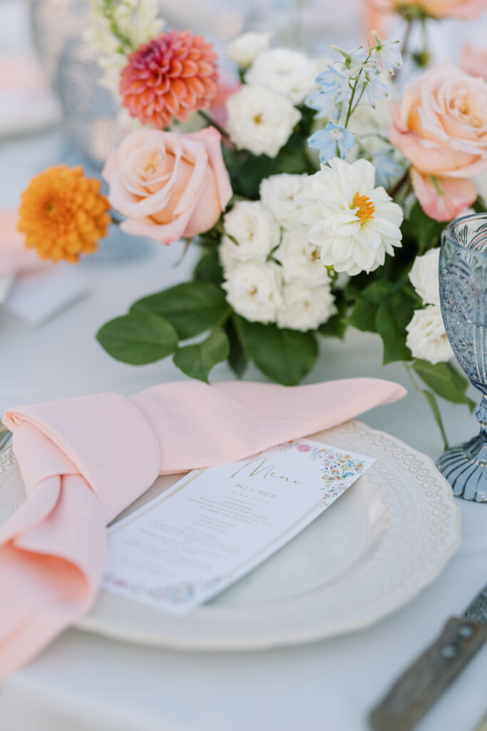The wedding design drew inspiration from a European Tuscan garden set against the vineyard backdrop. Soft peach, apricot, coral, dusty blue, ivory, and fresh greenery created a dreamy palette that felt both colorful and refined.