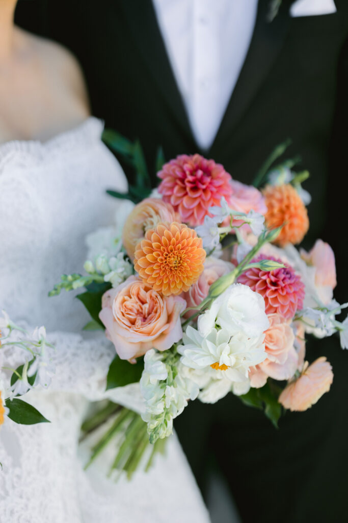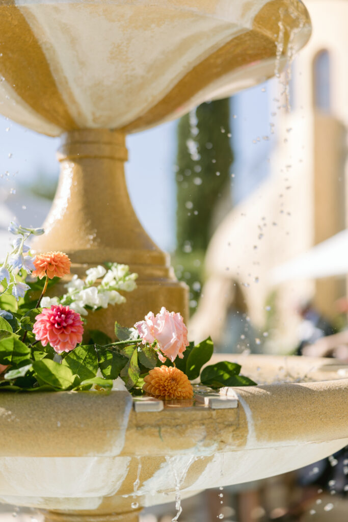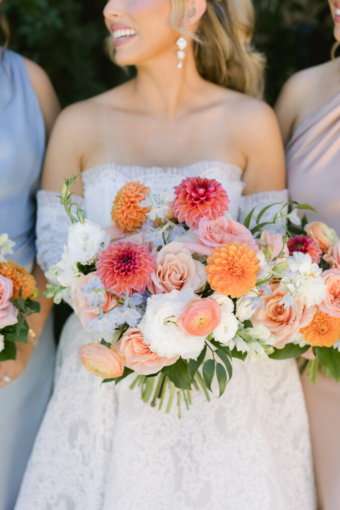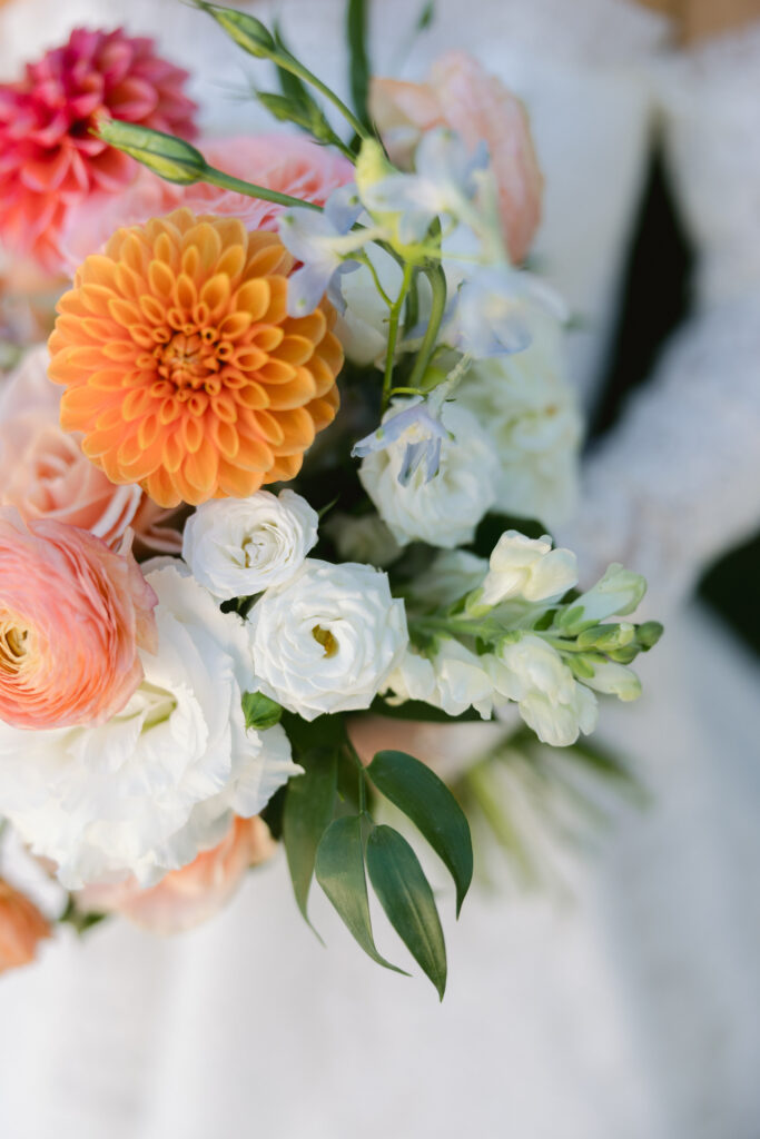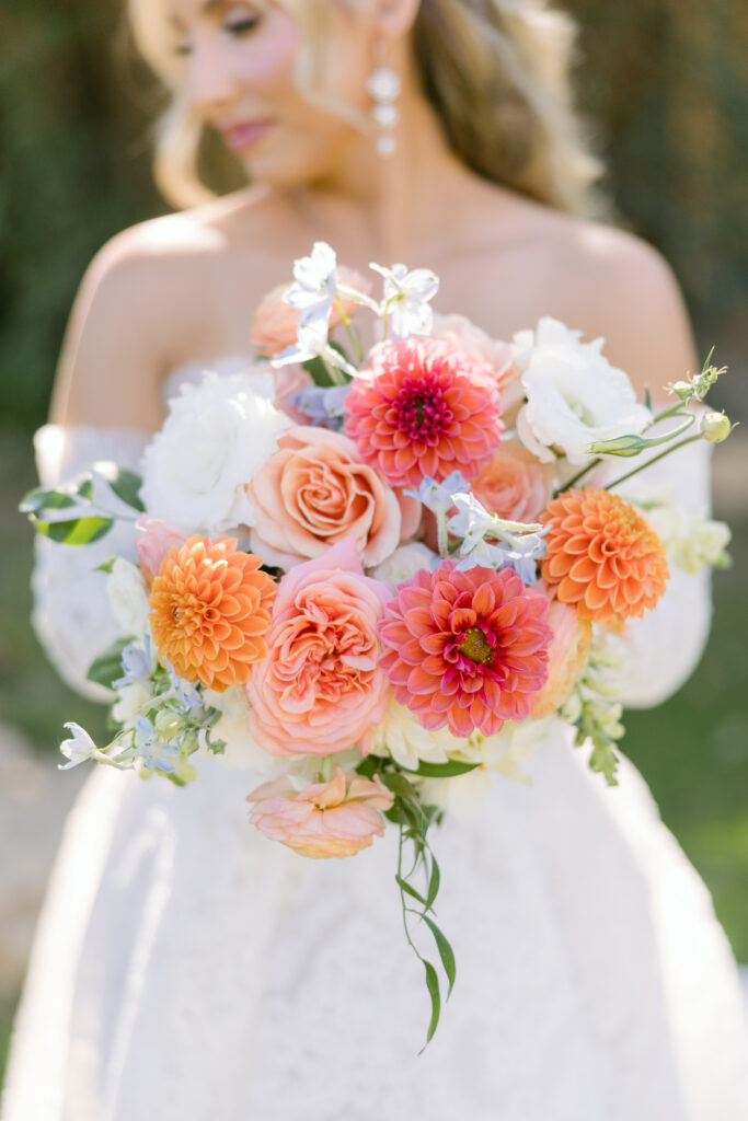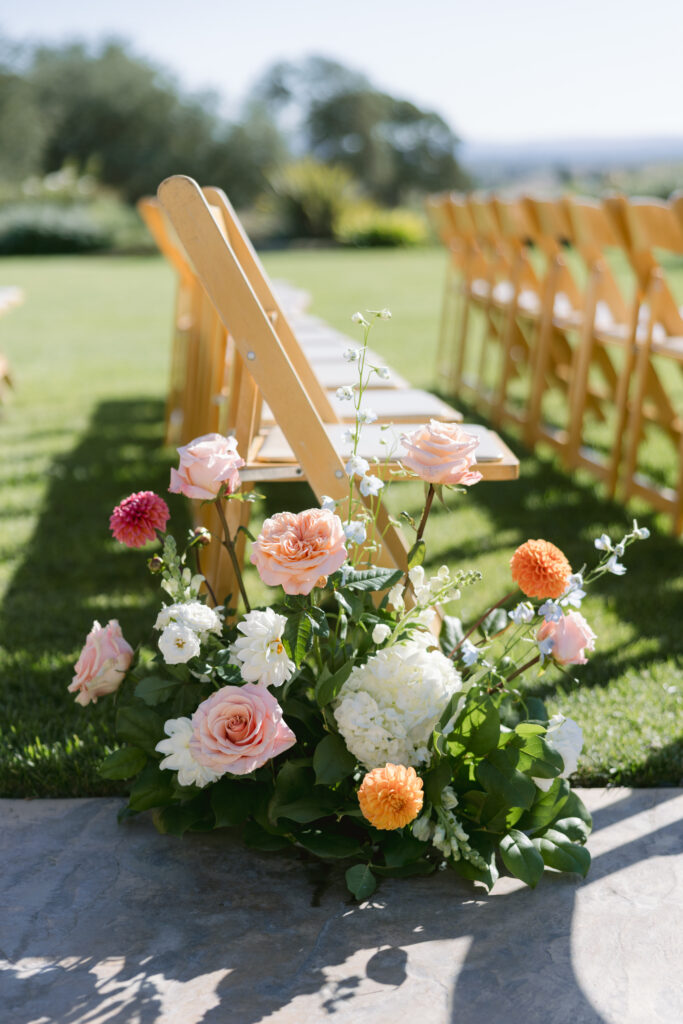 The wedding design drew inspiration from a European Tuscan garden set against the vineyard backdrop. Soft peach, apricot, coral, dusty blue, ivory, and fresh greenery created a dreamy palette that felt both colorful and refined.