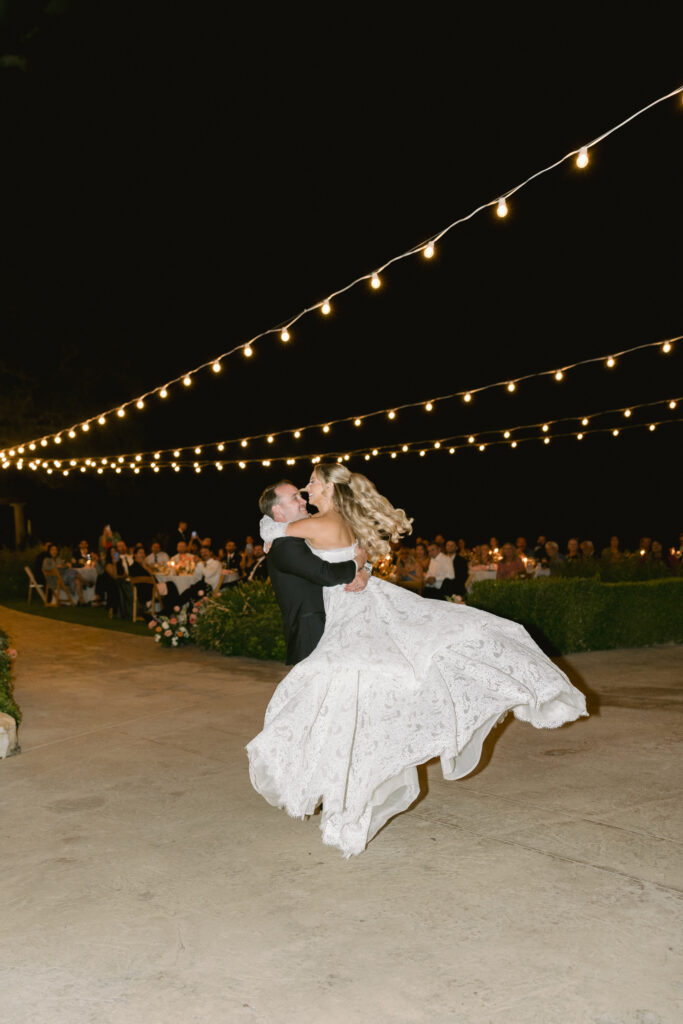 Florals featured garden roses, ranunculus, lisianthus, dahlias, and delphinium arranged in lush, layered compositions. Meanwhile, reception tables brought warmth and elegance through lace chargers, gold flatware, delicate menus, and glowing hurricanes with taper candles on gold candlesticks.